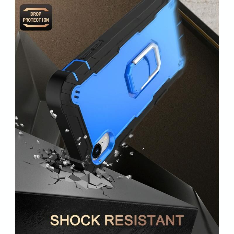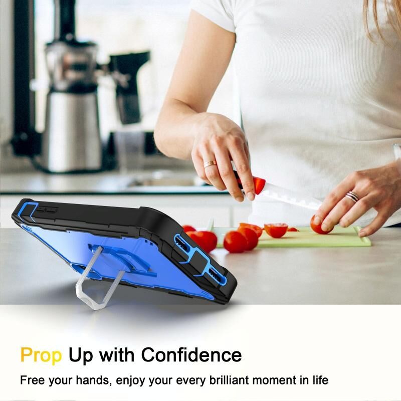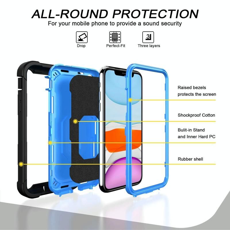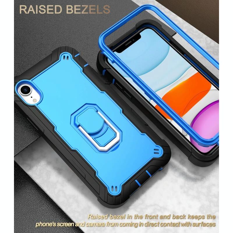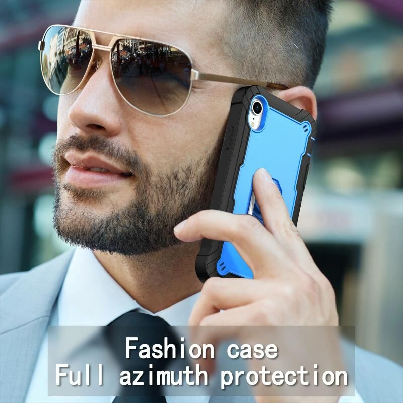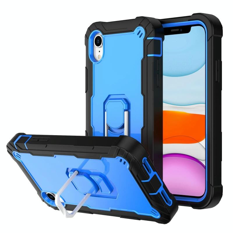 For iPhone XR PC + Rubber 3-layers Shockproof Protective Case with Rotating Holder(Black + Blue)