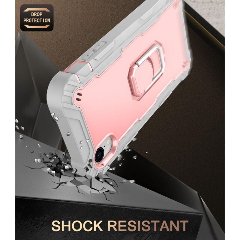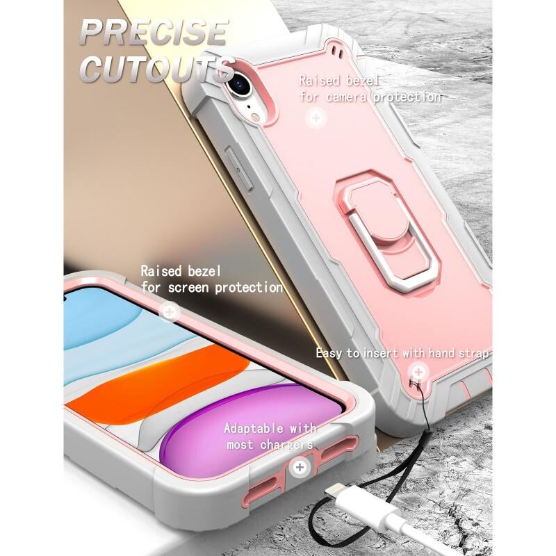 For iPhone XR PC + Rubber 3-layers Shockproof Protective Case with Rotating Holder(Grey White + Rose Gold)