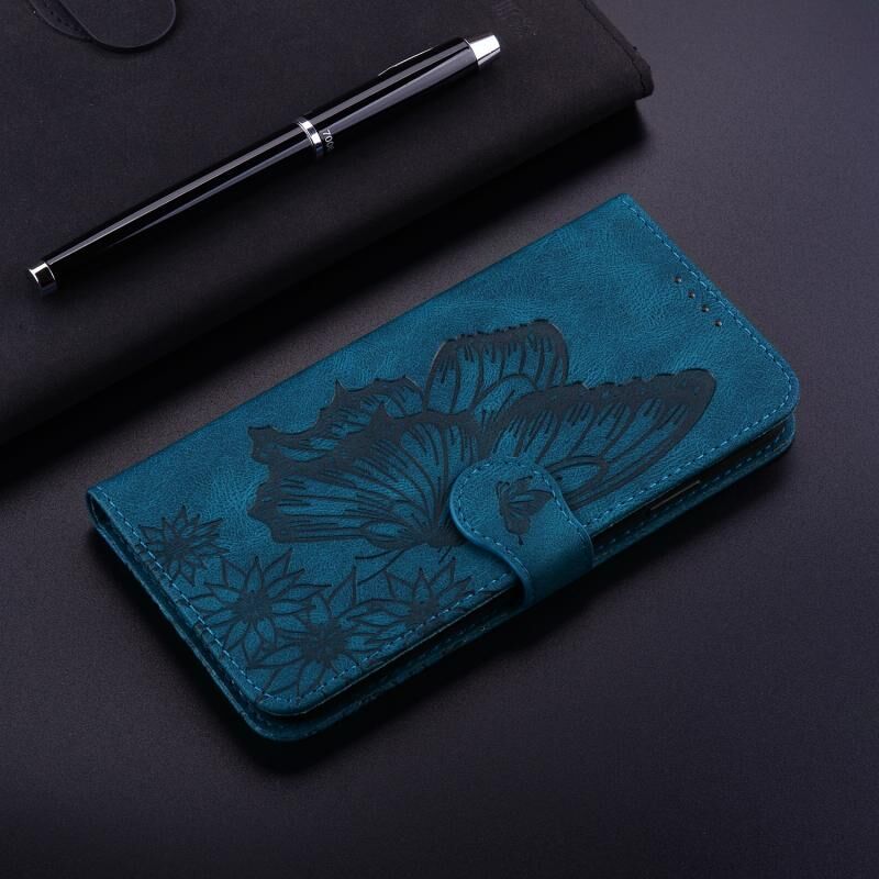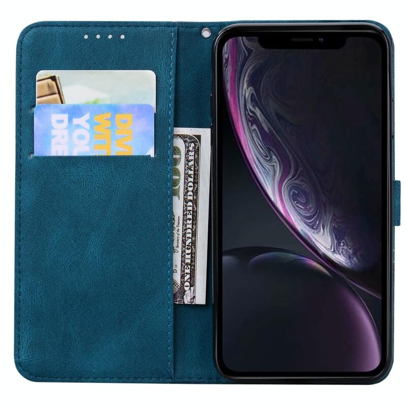 Θήκη για iPhone XR με ανάγλυφο σχέδιο πεταλούδων σε ρετρό δέρμα, οριζόντια, με βάση στήριξης, θήκες για κάρτες και πορτοφόλι (Μπλε)