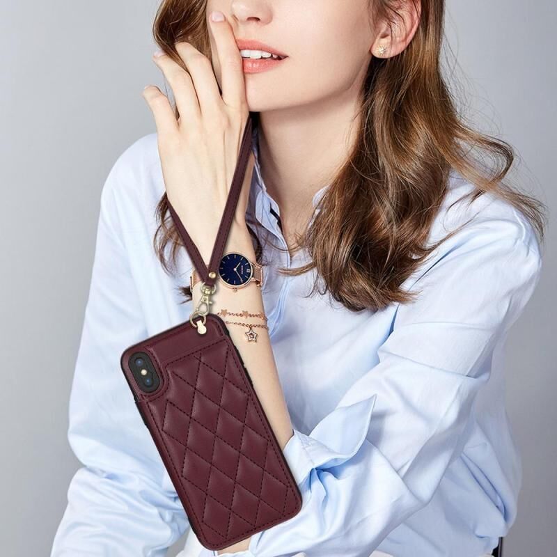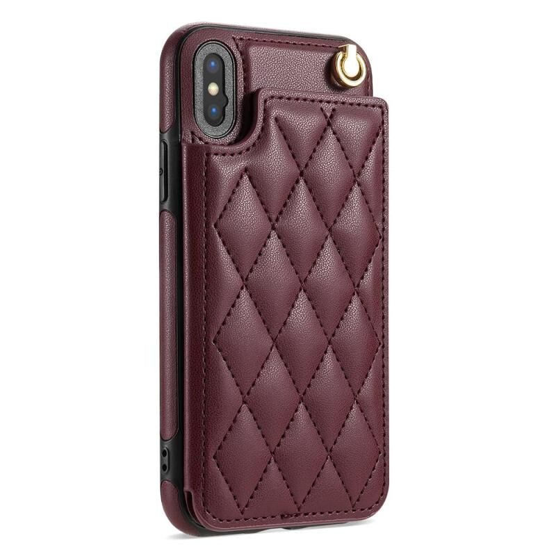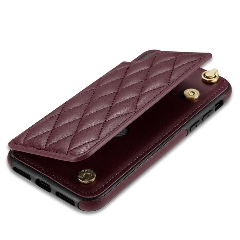For iPhone XR Rhombic Dual Buckle Card Slots Phone Case with Lanyard(Wine Red)