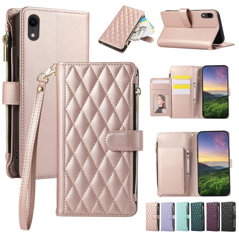 For iPhone XR Rhombic Zipper Wallet Leather Phone Case(Rose Gold)