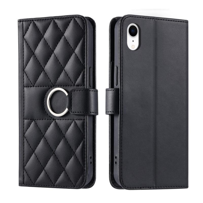 For iPhone XR Ring Buckle Rhombic Leather Phone Case(Black)