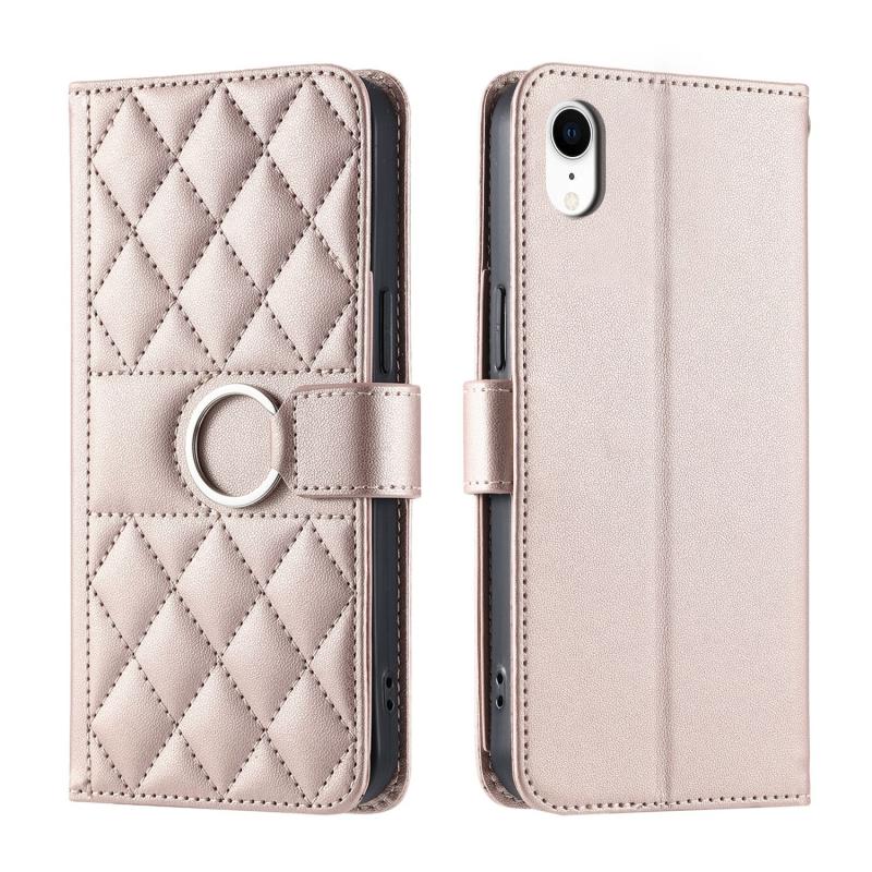 For iPhone XR Ring Buckle Rhombic Leather Phone Case(Rose Gold)