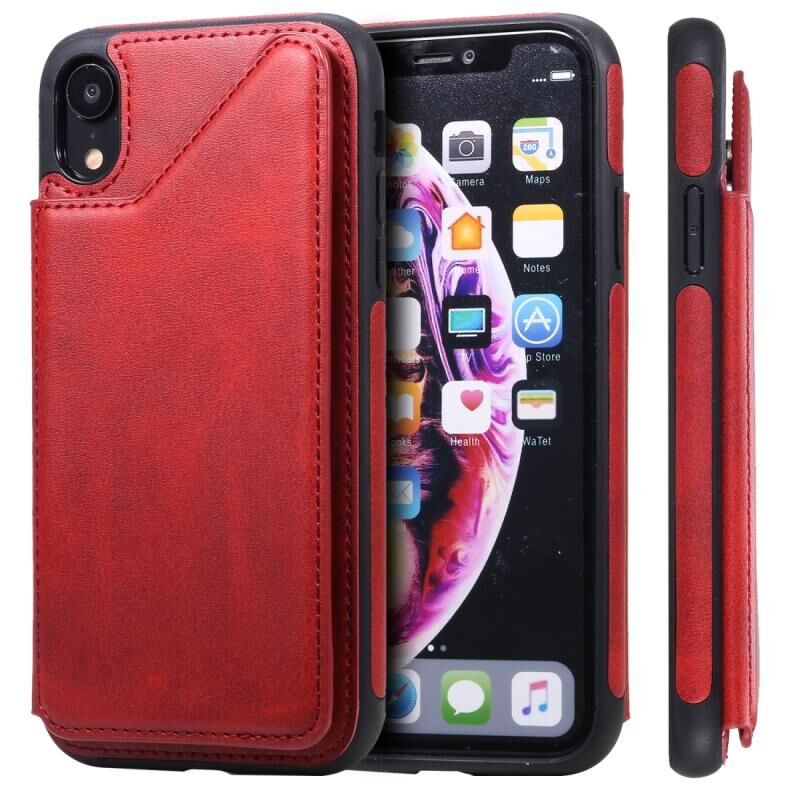 Θήκη προστασίας για iPhone XR με αντικραδασμική υφή δέρματος μοσχαριού, με βάση στήριξης & θήκες για κάρτες & πλαίσιο (Κόκκινο)