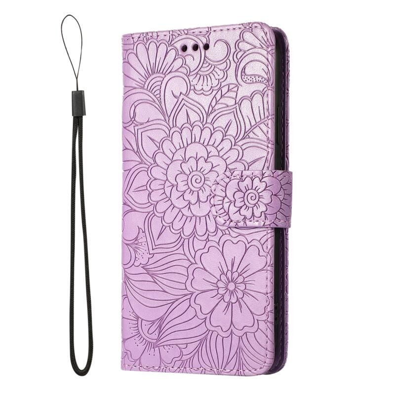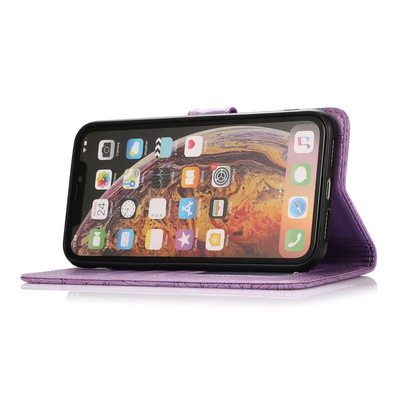 Θήκη δέρματος οριζόντιας αναδίπλωσης για iPhone XR με υφή δέρματος, ανάγλυφο ηλίανθο, με βάση, θήκες καρτών, πορτοφόλι και λουρί (Μωβ)