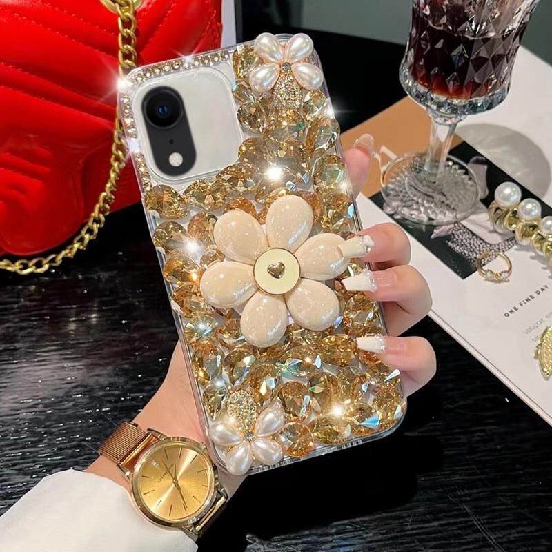 Θήκη κινητού τηλεφώνου για iPhone XR με σχέδιο ηλιοτρόπιο, λαβή και διακοσμητικά κρύσταλλα (Ροζ)