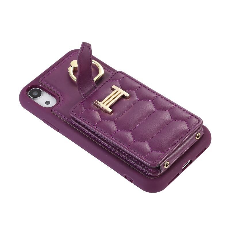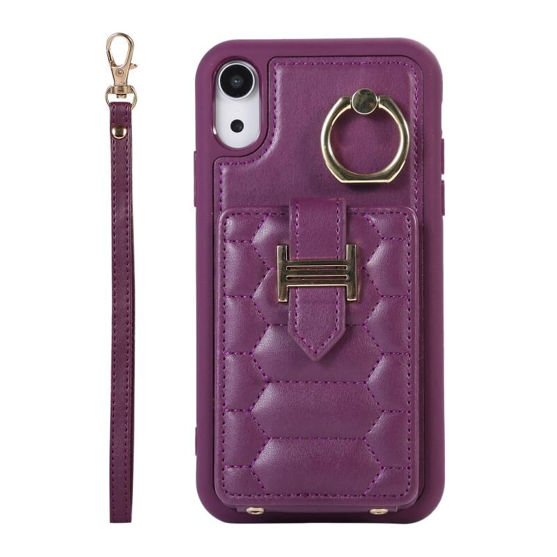 For iPhone XR Vertical Card Bag Ring Holder Phone Case with Dual Lanyard(Dark Purple)