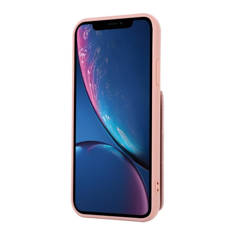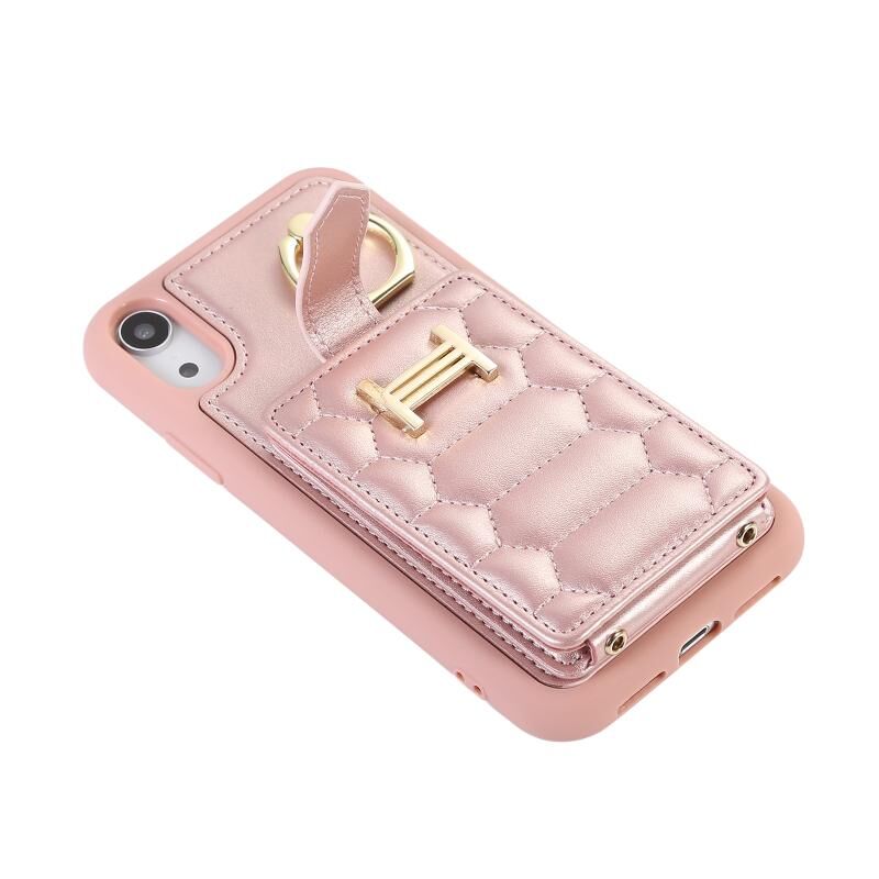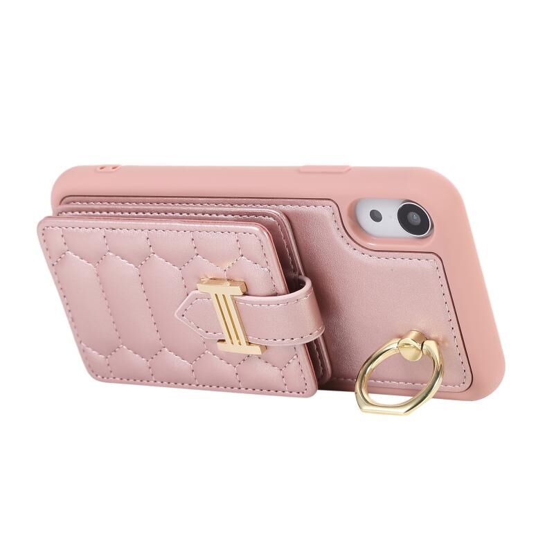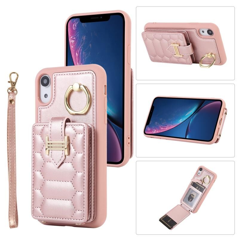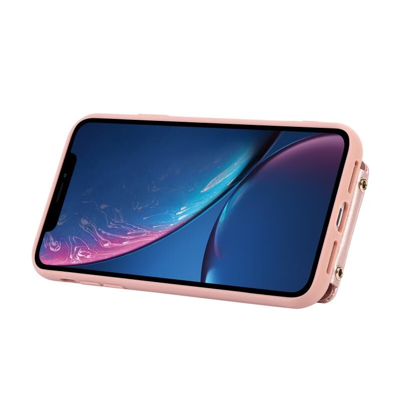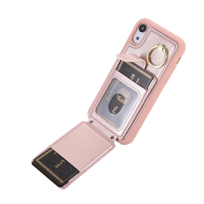 For iPhone XR Vertical Card Bag Ring Holder Phone Case with Dual Lanyard(Rose Gold)