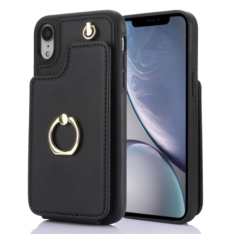 For iPhone XR YM005 Skin Feel Card Bag Phone Case with Long Lanyard(Black)