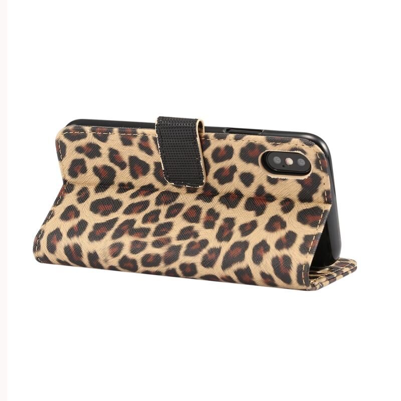 Θήκη δέρματος οριζόντιας αναδίπλωσης με σχέδιο λεοπάρδαλης για iPhone XS με βάση & θήκες καρτών (Καφέ)