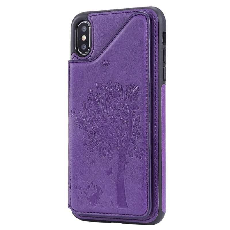 For iPhone XS Max Cat Tree Embossing Pattern Shockproof Protective Case with Card Slots & Photo Frame & Holder(Purple)