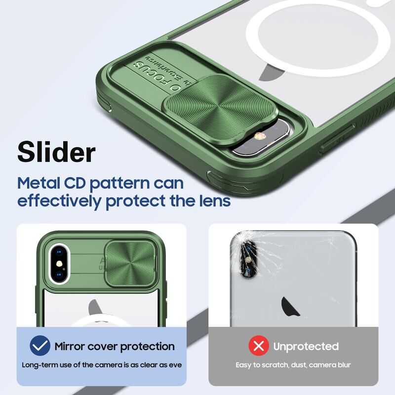 Θήκη κινητού τηλεφώνου πλήρους κάλυψης με συρόμενο κάλυμμα φακού MagSafe για iPhone XS Max, διαφανές ακρυλικό + PC + TPU (Χακί)