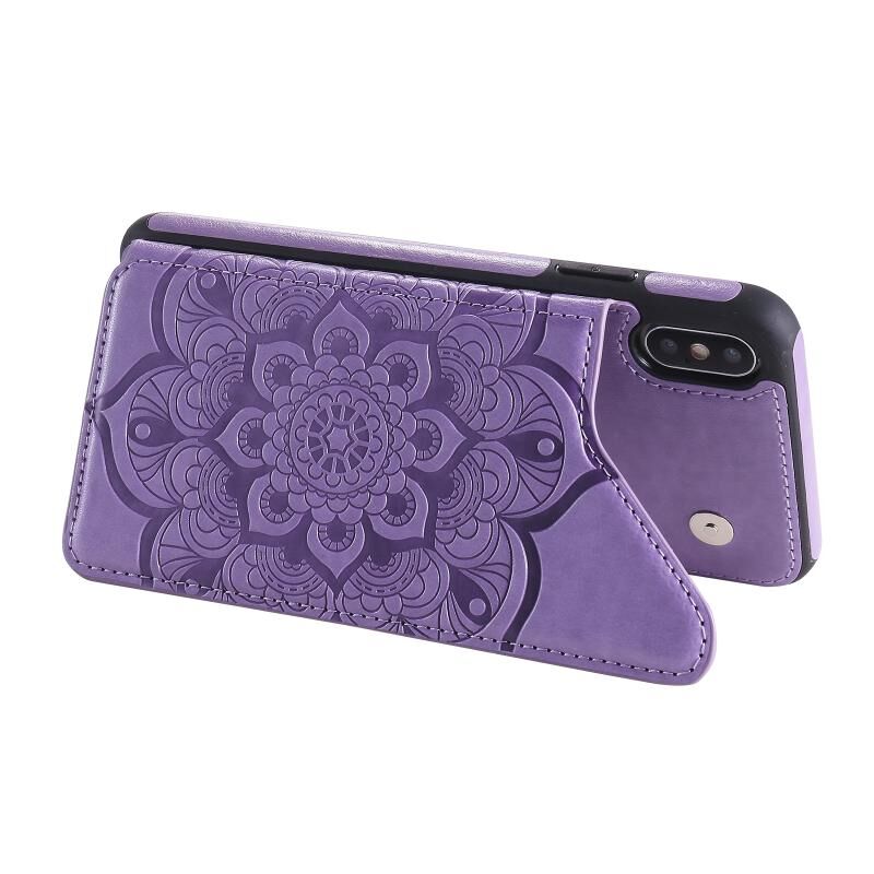 For iPhone XS Max Flower Embossing Pattern Shockproof Protective Case with Holder & Card Slots & Photo Frame(Purple)