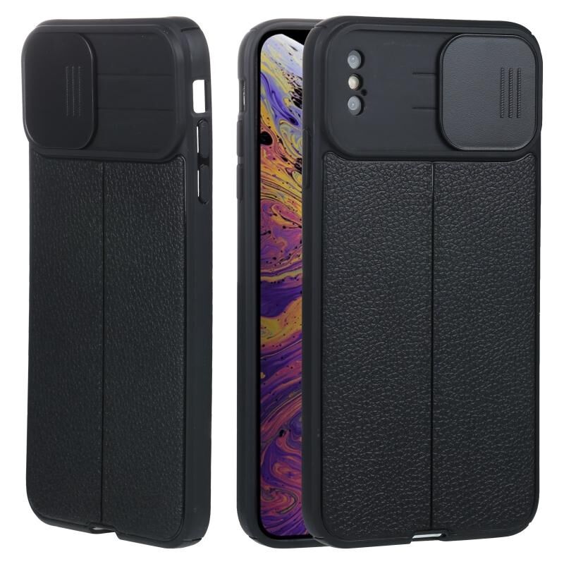 Θήκη προστασίας κινητού τηλεφώνου TPU με υφή δέρματος Litchi και συρόμενο κάλυμμα κάμερας για iPhone XS Max (Μαύρο)