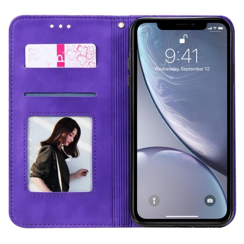 Θήκη δέρματος με μαγνητικό κλείσιμο, οριζόντια, με ανάγλυφο σχέδιο τυχερών λουλουδιών και θήκη/υποδοχές για κάρτες για iPhone XS Max (Μωβ)