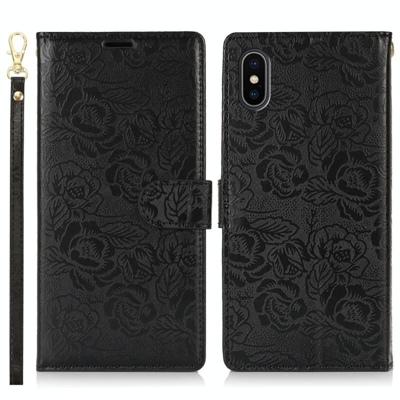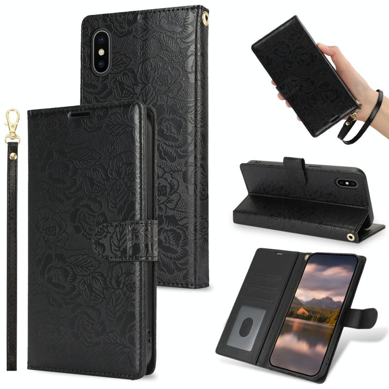For iPhone XS Max Peony Flowers Imprint Leather Phone Case(Black)