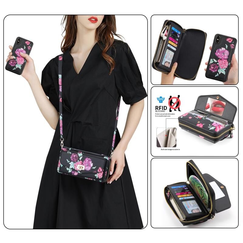Θήκη τηλεφώνου για iPhone XS Max POLA Flower, πολυλειτουργική, crossbody με φερμουάρ και δέρμα (Μαύρο)