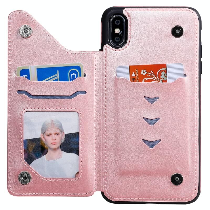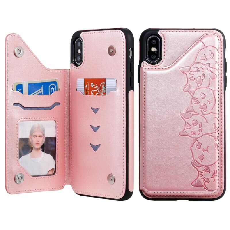 For iPhone XS Max Six Cats Embossing Pattern Protective Case with Holder & Card Slots & Photo Frame(Rose Gold)