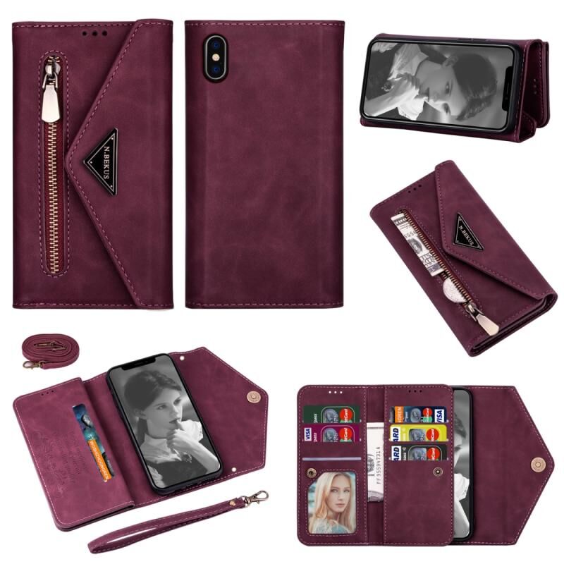 Θήκη δέρματος οριζόντιας αναδίπλωσης για iPhone XS Max με αίσθηση δέρματος, φερμουάρ, θήκη, υποδοχές καρτών, κορνίζα φωτογραφιών, κορδόνι και μακρύ σχοινί (Μαύρο)