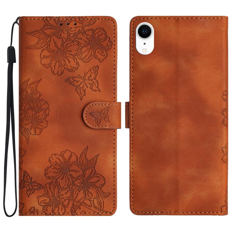For iPhone XS / X Cherry Blossom Butterfly Skin Feel Embossed PU Phone Case(Brown)
