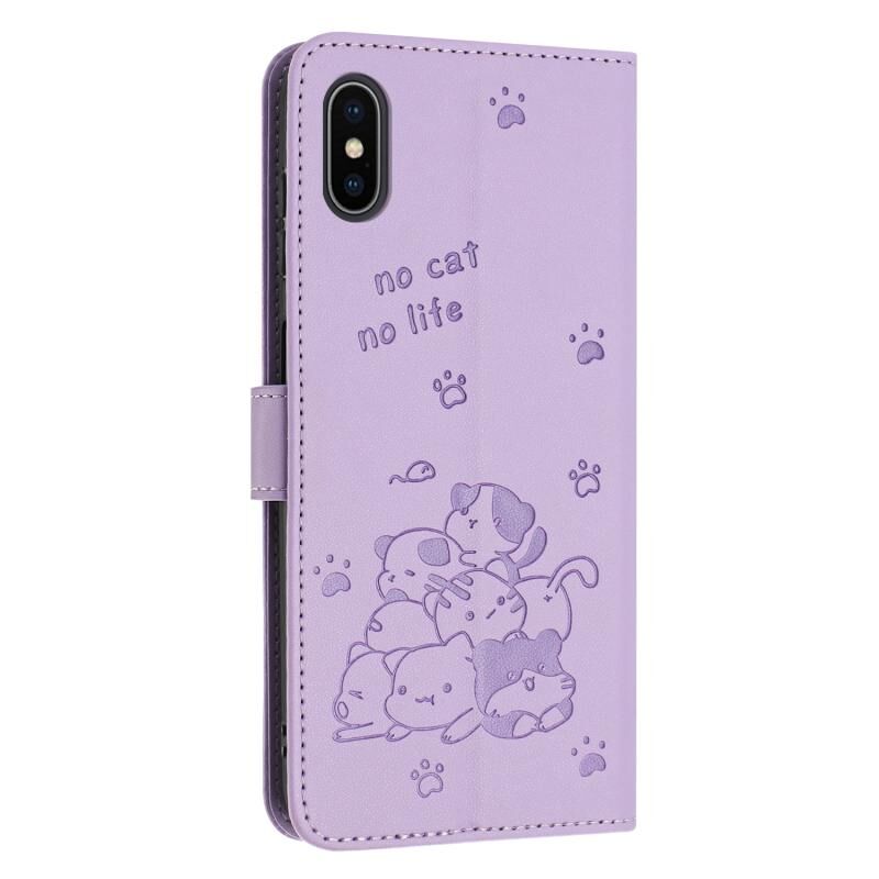 Θήκη δερμάτινη για iPhone XS / X με ανάγλυφο γατάκι και κορδόνι (Μωβ)