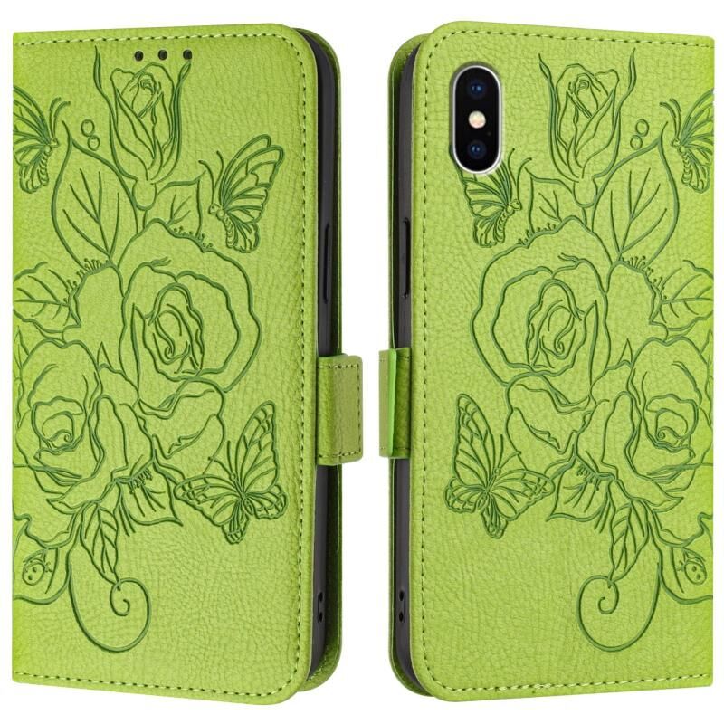 Θήκη τηλεφώνου από δέρμα με ανάγλυφο τριαντάφυλλο και προστασία RFID κατά της κλοπής για iPhone XS / X (Πράσινο)