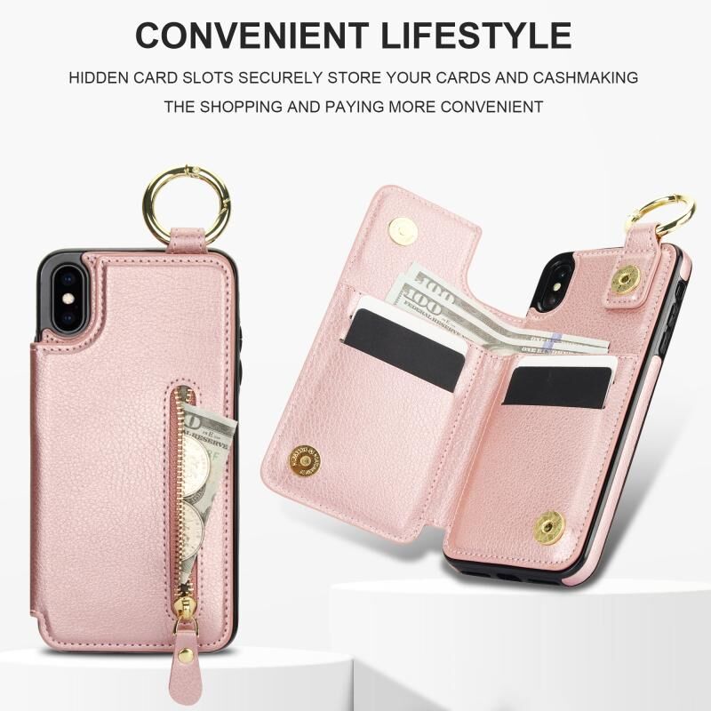Για iPhone XS / X Litchi υφή φερμουάρ διπλή πόρπη κάρτα τσάντα υπόθεση τηλεφώνου (Rose Gold)