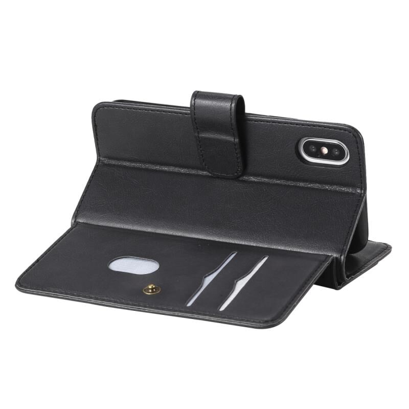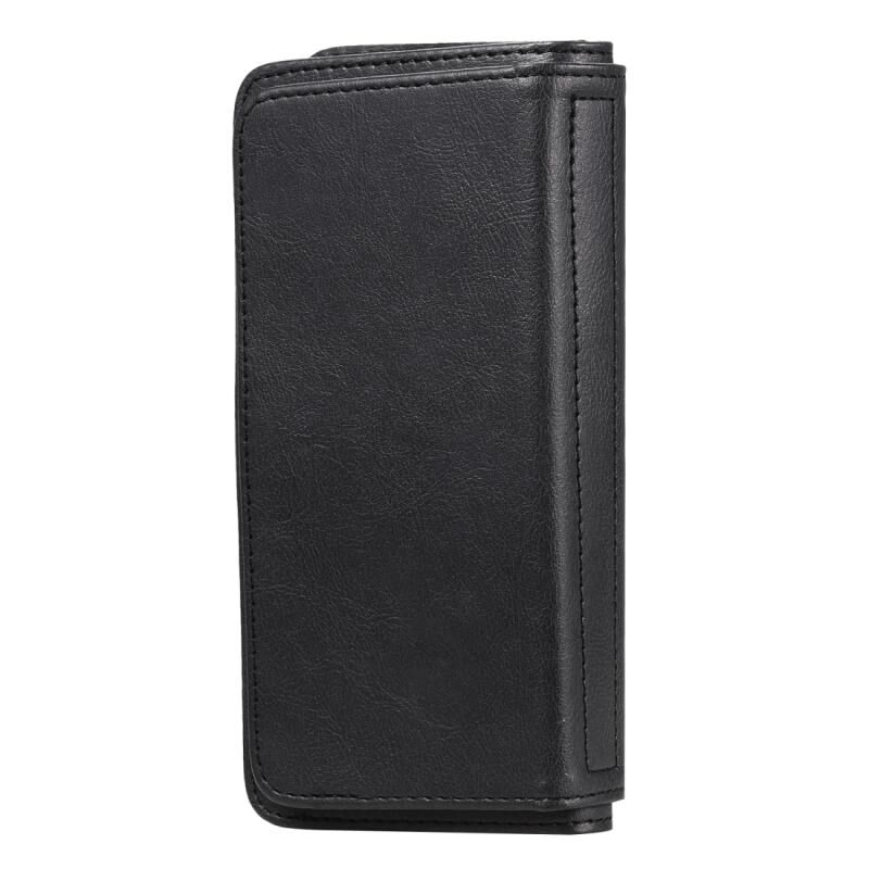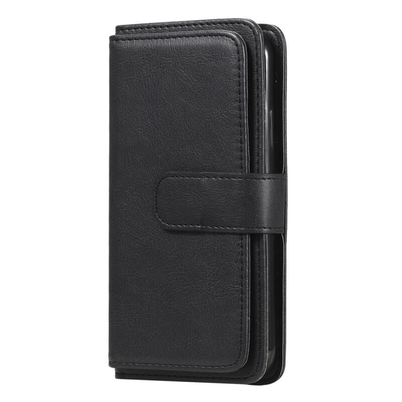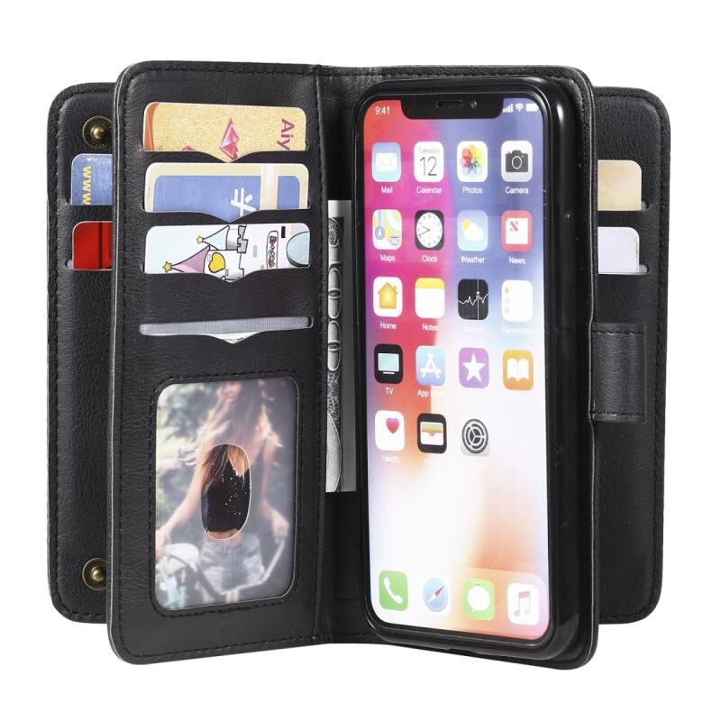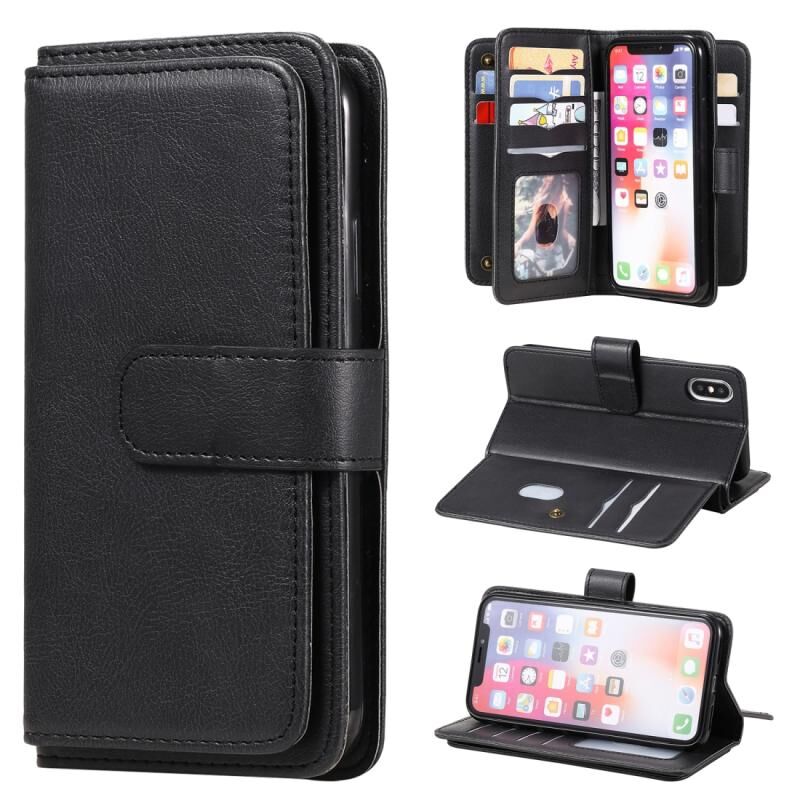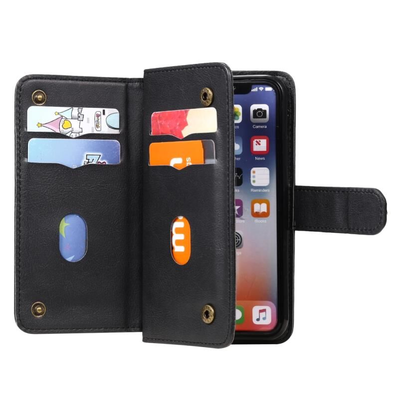 Θήκη για iPhone XS / X, πολυλειτουργική μαγνητική θήκη από δέρμα με αγκράφα από χαλκό, οριζόντια, μονόχρωμη, με 10 υποδοχές για κάρτες, πορτοφόλι, βάση & κορνίζα φωτογραφιών (Μαύρο)