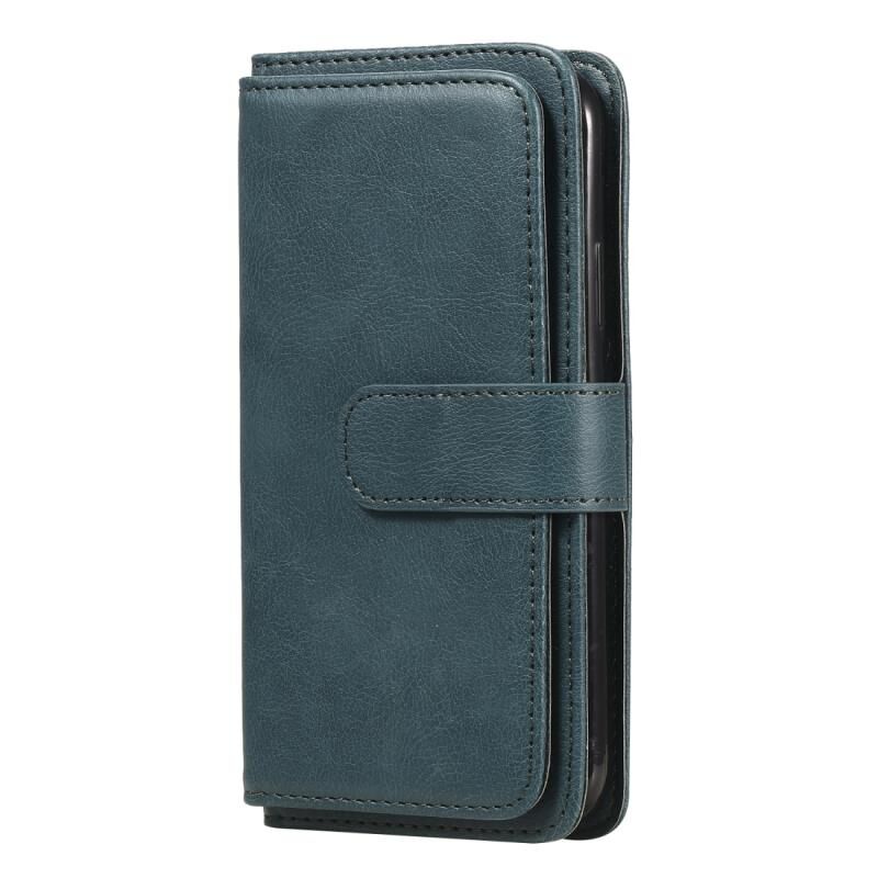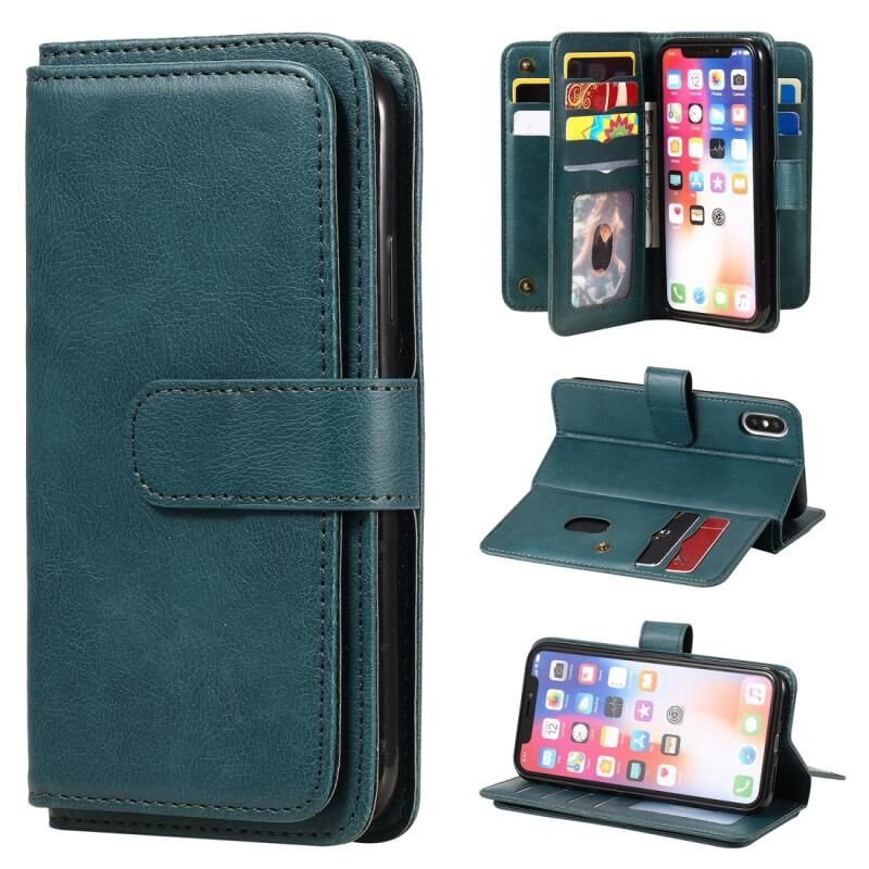 Θήκη για iPhone XS / X, πολυλειτουργική μαγνητική με αγκράφα από χαλκό, οριζόντια, μονόχρωμη δερμάτινη με 10 θήκες για κάρτες, πορτοφόλι, βάση & κορνίζα φωτογραφιών (Κρασί)