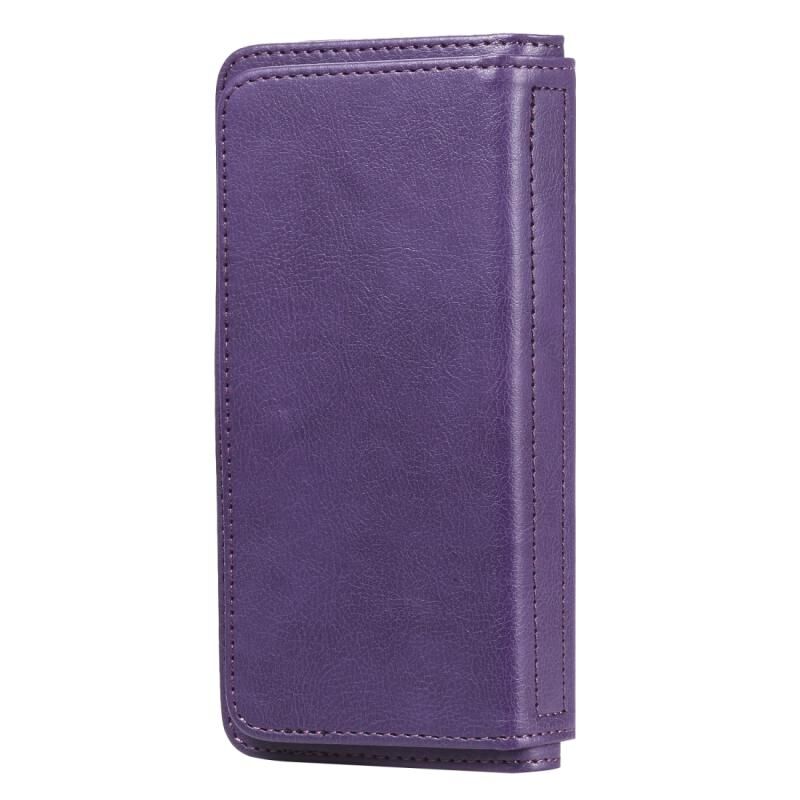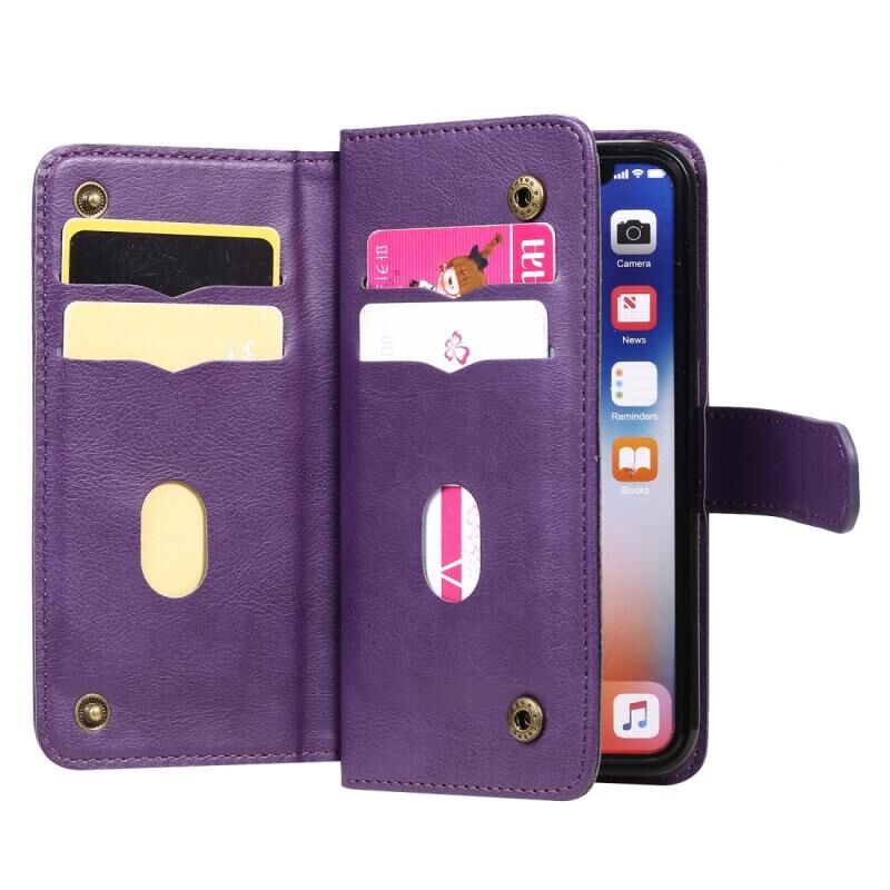 Θήκη για iPhone XS / X, πολυλειτουργική μαγνητική με αγκράφα από χαλκό, οριζόντια, μονόχρωμη δερμάτινη με 10 θήκες για κάρτες, πορτοφόλι, βάση & κορνίζα φωτογραφιών (Κρασί)