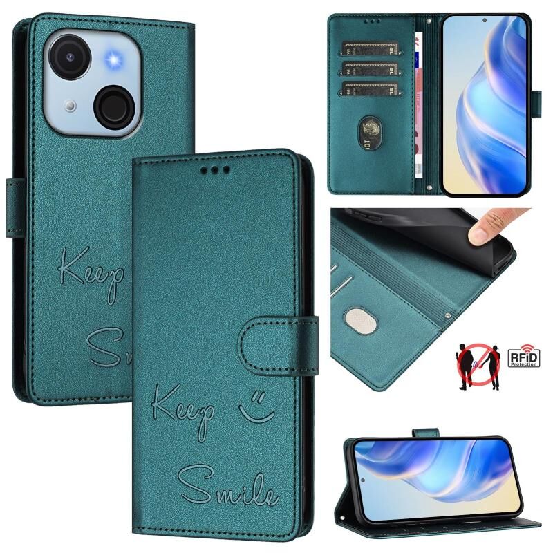 Για itel A50C Χαμόγελο ανάγλυφο RFID δερμάτινη θήκη τηλεφώνου (Πράσινο παγώνι)