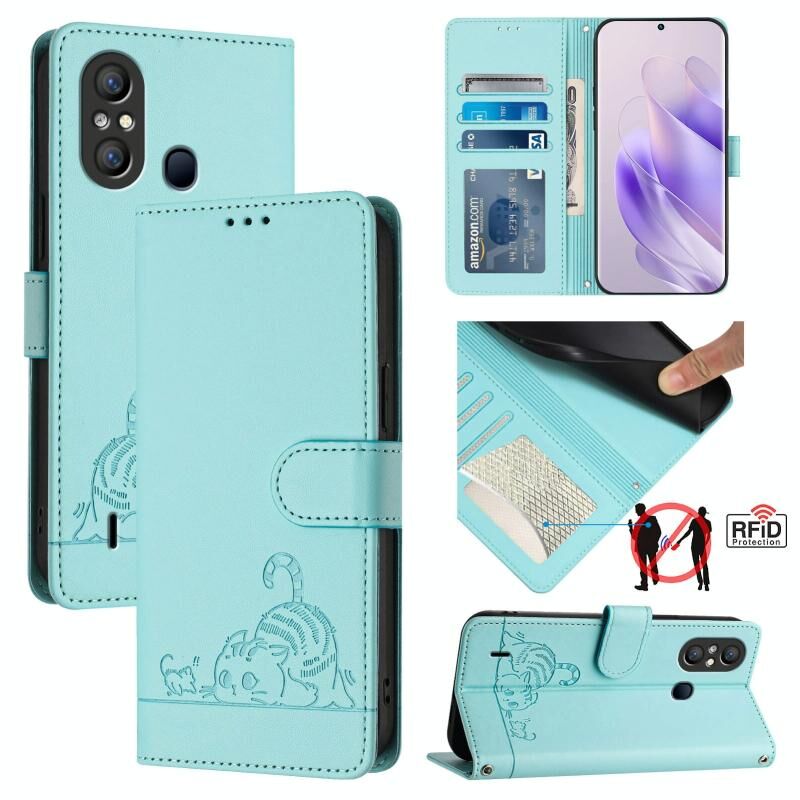 Θήκη τηλεφώνου από δέρμα με ανάγλυφο σχέδιο γάτας και ποντικού για itel A58 / A49 με RFID και λουρί (Μέντας Πράσινο)