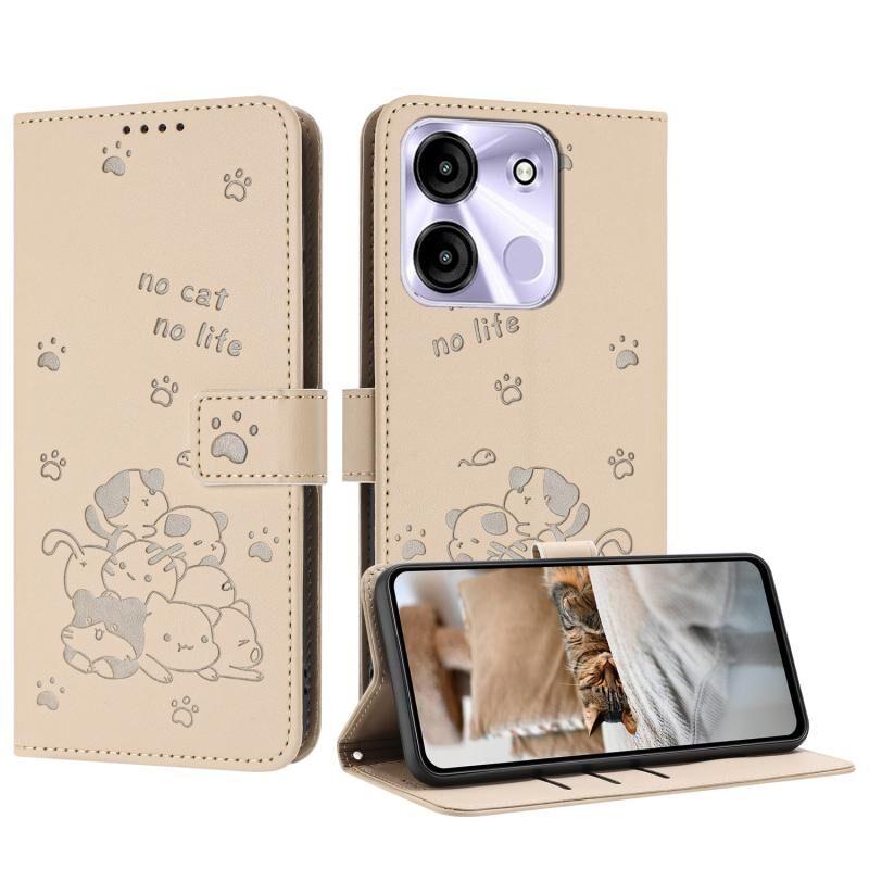 Θήκη δέρματος τηλεφώνου με ανάγλυφο γατάκι και λουρί για itel A60 / A60s (Μπεζ)