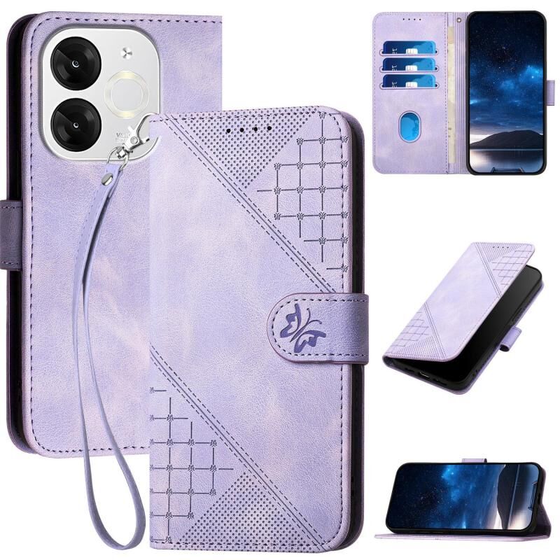 Θήκη τηλεφώνου δερμάτινη με ανάγλυφο σχέδιο πλέγματος και πεταλούδας για Itel A80 με κορδόνι (Ανοιχτό Μωβ)