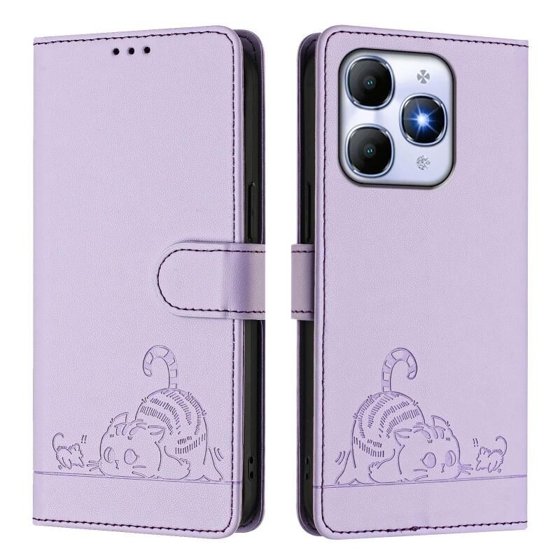 For Itel A90 Cat Rat Embossed Pattern RFID Leather Phone Case with Lanyard(Purple)