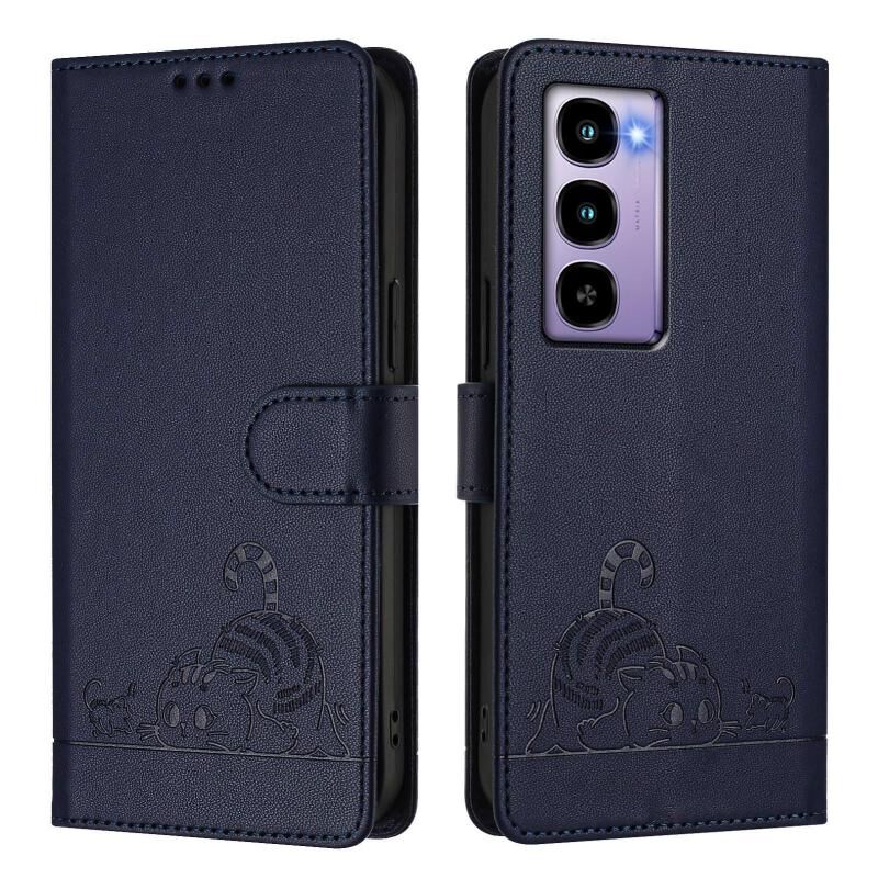 For Itel City 100 Cat Rat Embossed Pattern RFID Leather Phone Case with Lanyard(Blue)