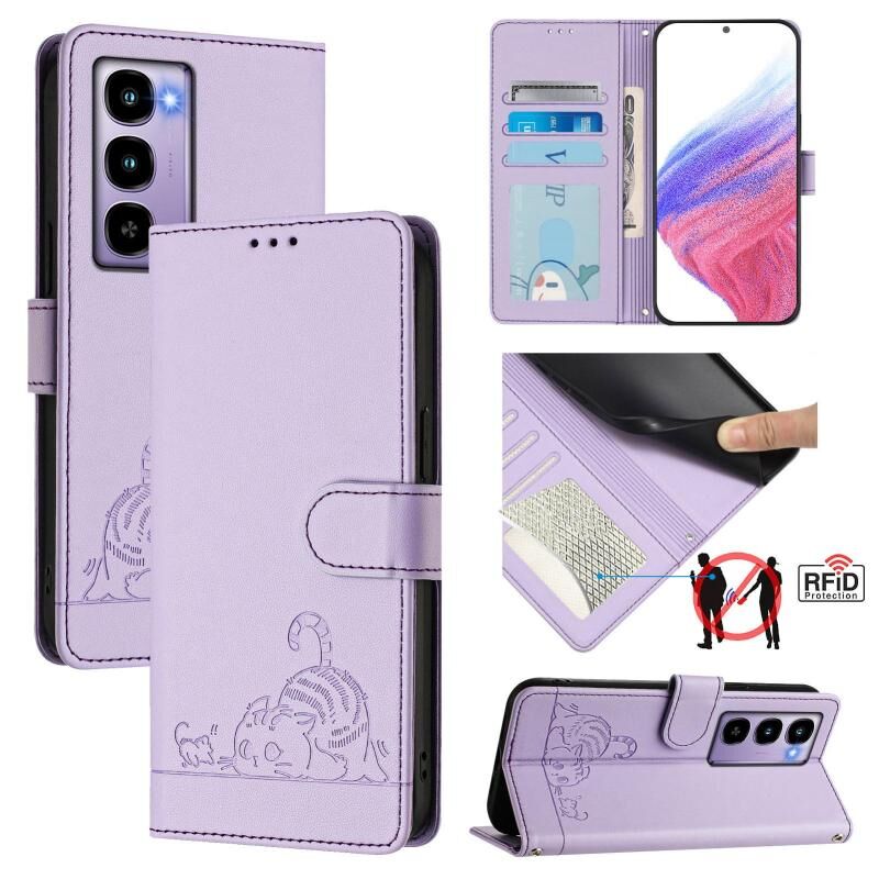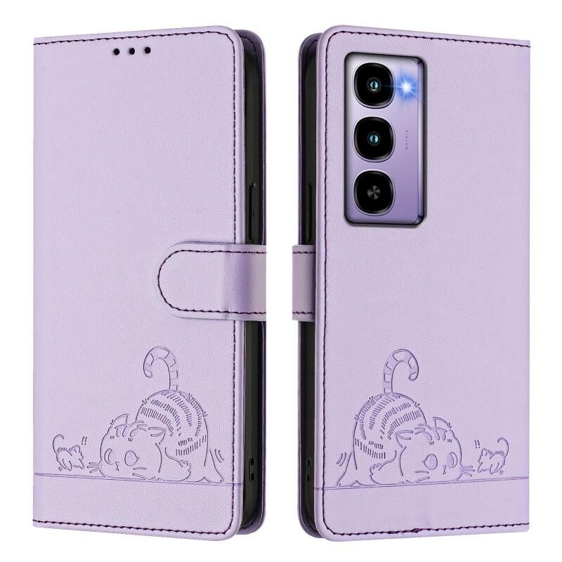 For Itel City 100 Cat Rat Embossed Pattern RFID Leather Phone Case with Lanyard(Purple)