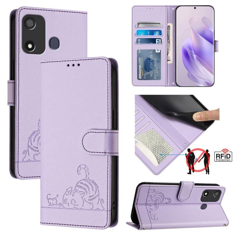 Θήκη τηλεφώνου από δέρμα με ανάγλυφο σχέδιο γάτας και ποντικιού για itel P17 / A27 με RFID και λουρί (Μωβ)