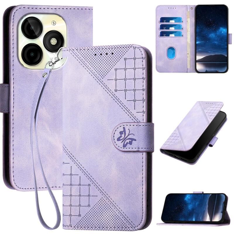 For Itel P65C Grid Butterfly Embossed Pattern Leather Phone Case with Lanyard(Light Purple)
