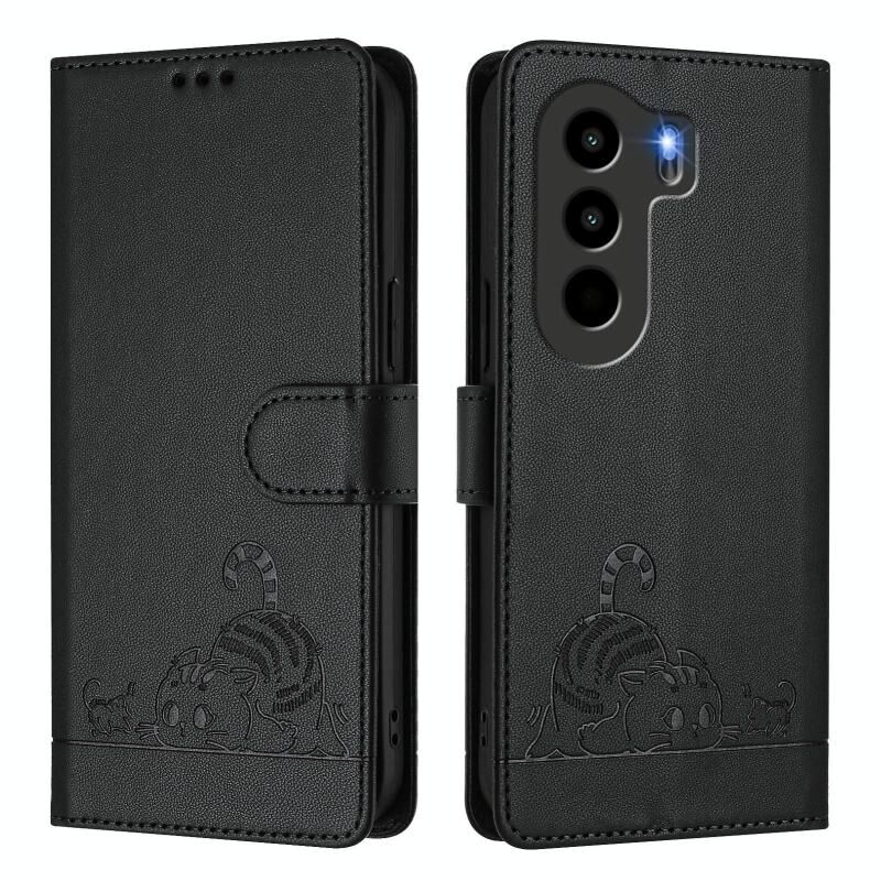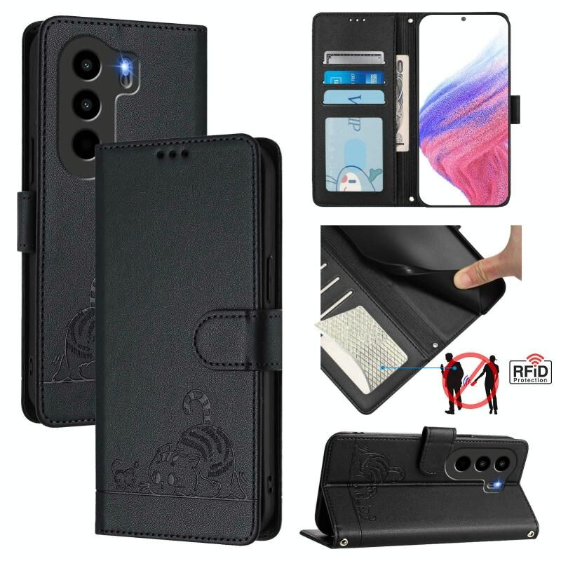 Θήκη τηλεφώνου από δέρμα με ανάγλυφο σχέδιο γάτας και ποντικιού για itel Power 70 με RFID και κορδόνι (Μέντας Πράσινο)