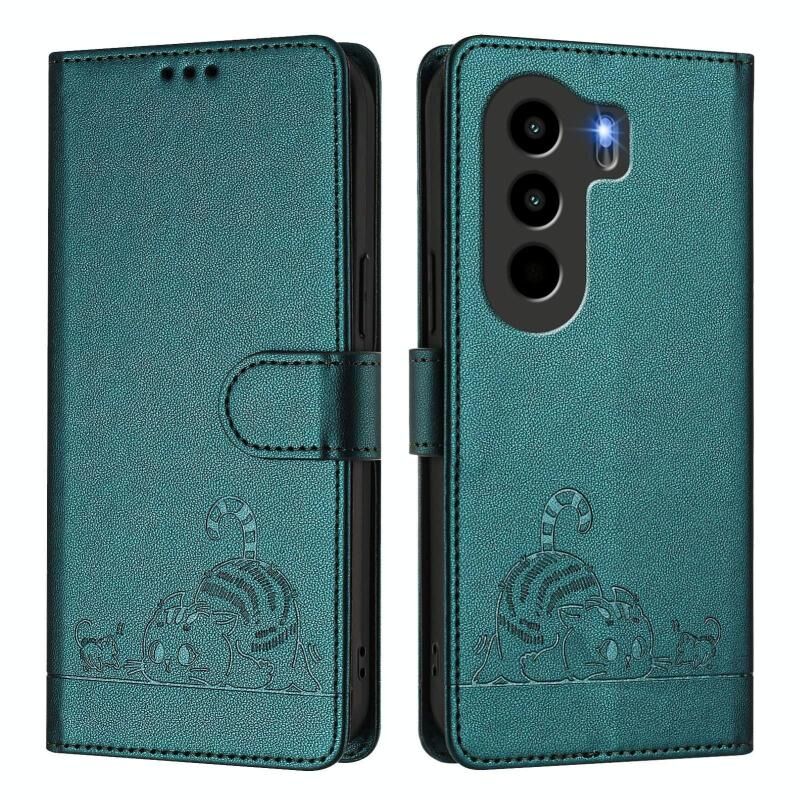 Θήκη τηλεφώνου από δέρμα με ανάγλυφο σχέδιο γάτας και ποντικιού για itel Power 70 με RFID και κορδόνι (Μέντας Πράσινο)