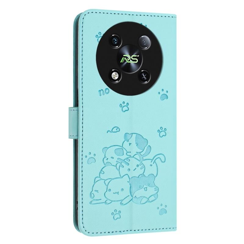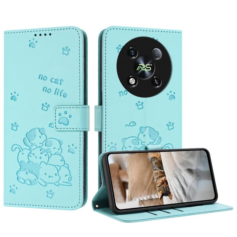 Θήκη δερμάτινη για itel RS4 με ανάγλυφο σχέδιο γατάκι και κορδόνι (Μέντας πράσινο)
