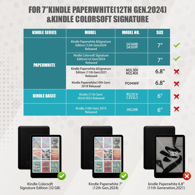 1. Compatibility: Designed for the 7-inch 12th Generation Kindle Paperwhite (2024 release), Kindle Paperwhite Signature Edition, and Kindle Colorsoft Signature Edition (7-inch), ensuring a snug and secure fit.