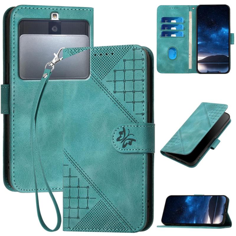 For Kyocera Basio 3 Grid Butterfly Embossed Pattern Flip Leather Phone Case with Lanyard(Light Blue)