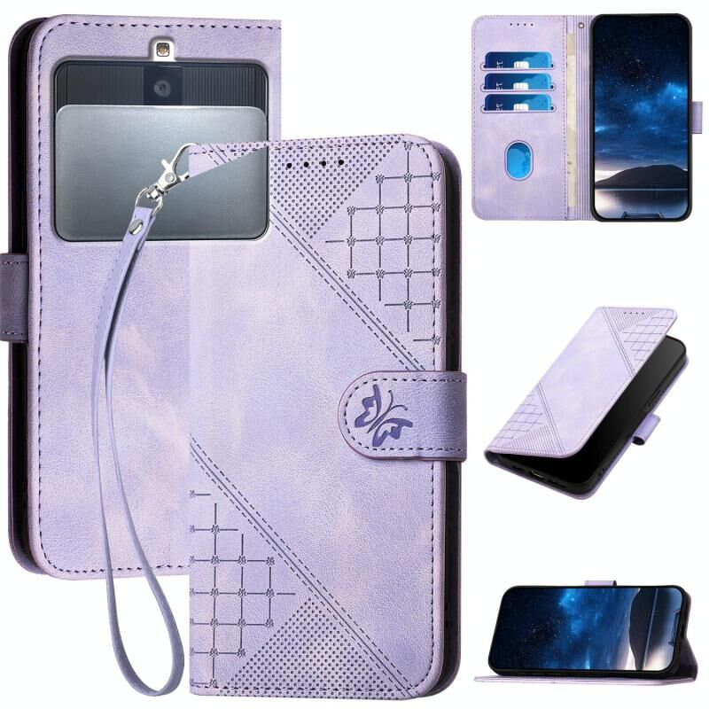 For Kyocera Basio 3 Grid Butterfly Embossed Pattern Flip Leather Phone Case with Lanyard(Light Purple)