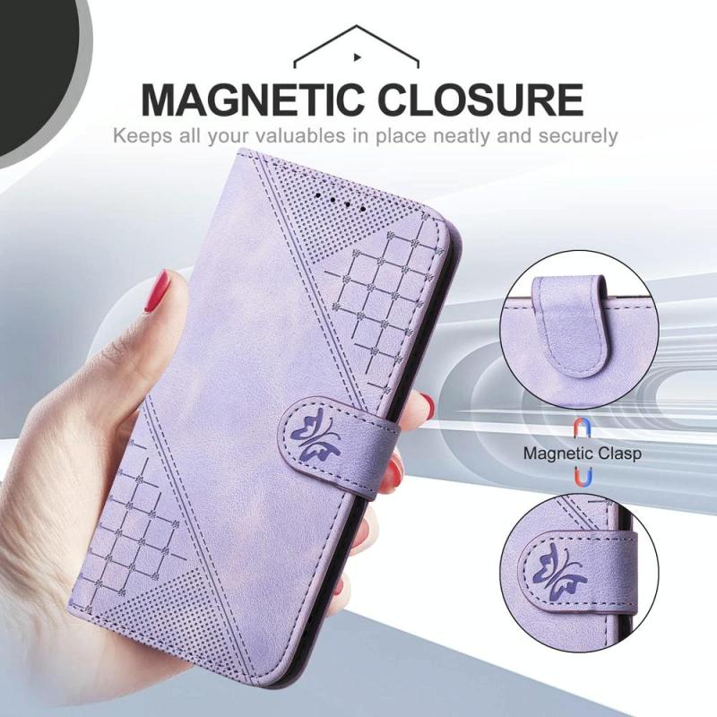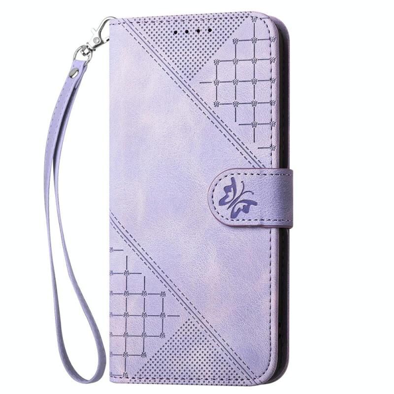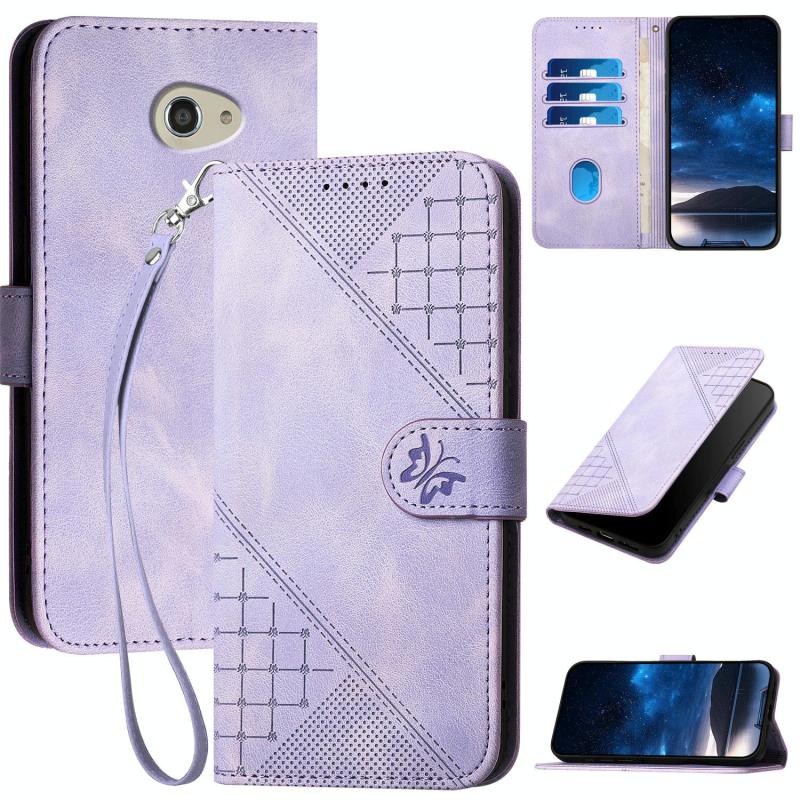 For Kyocera Basio 4 / Kantan Sumaho 2 A001KC Grid Butterfly Embossed Pattern Flip Leather Phone Case with Lanyard(Light Purple)
