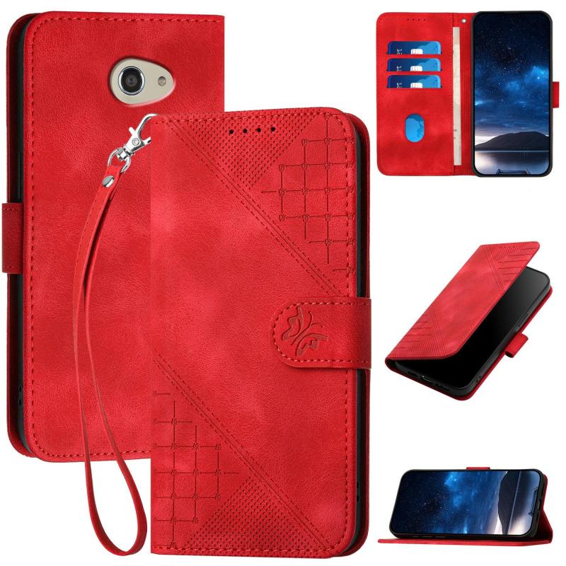 For Kyocera Basio 4 / Kantan Sumaho 2 A001KC Grid Butterfly Embossed Pattern Flip Leather Phone Case with Lanyard(Red)