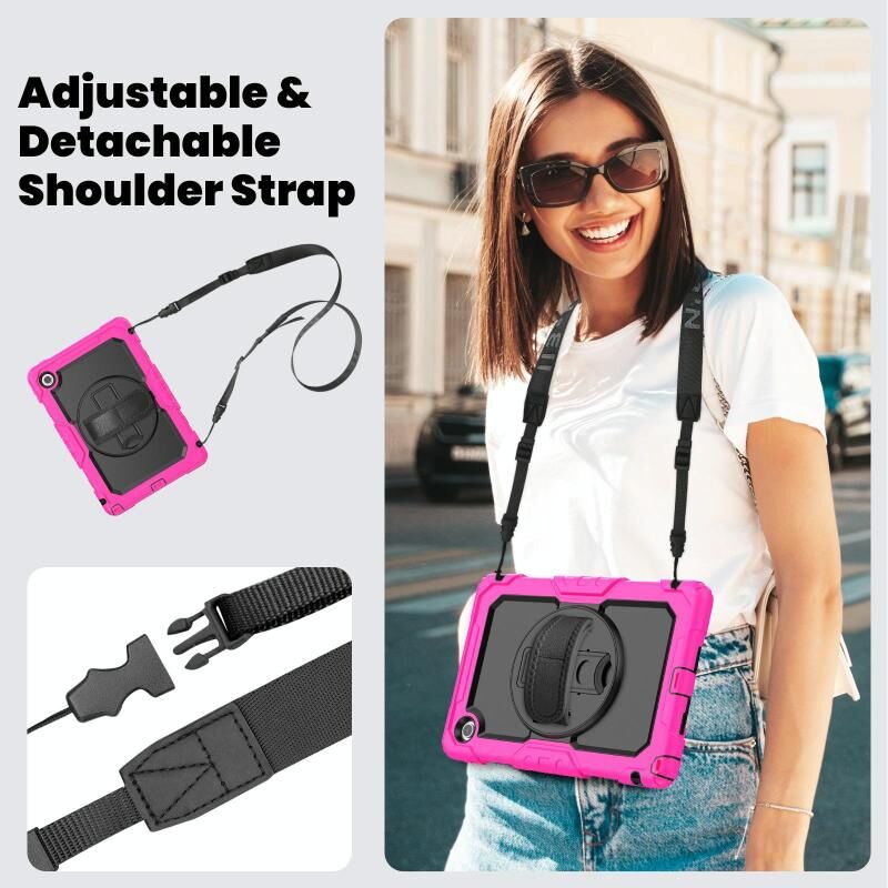 5. Shoulder Strap: Shoulder grip can be slanted and release your hands completely. This function is perfect for traveling, restaurant ordering, home product introduction, engineer outdoor operation, teacher, etc. Also, the strap allows you to hang up your tablet behind car seat for entertainment for kids.