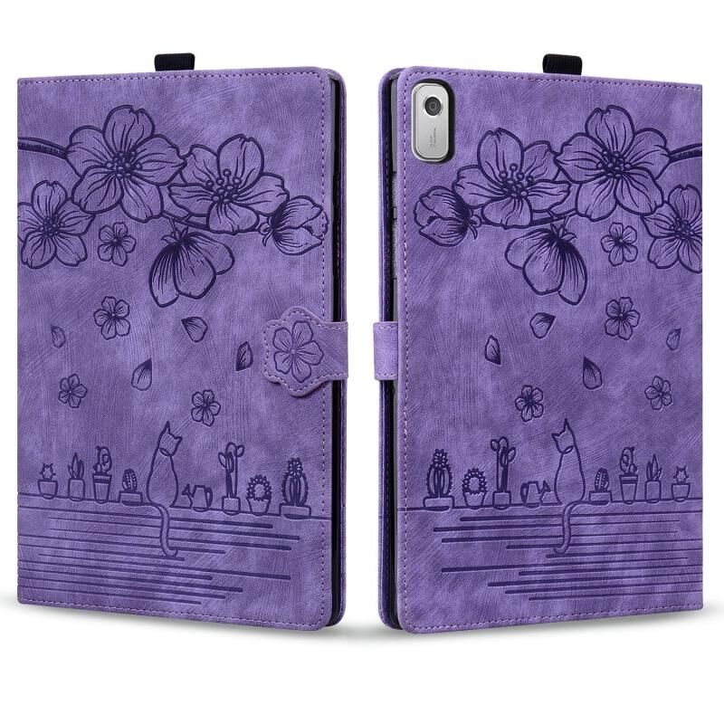 For Lenovo Tab M9 Cartoon Sakura Cat Embossed Leather Tablet Case(Purple)