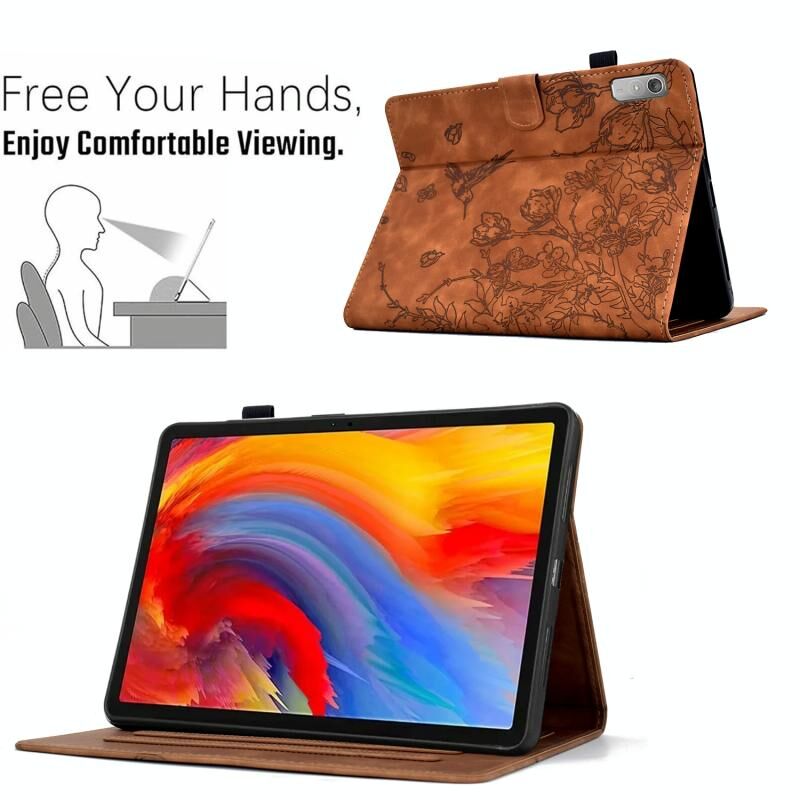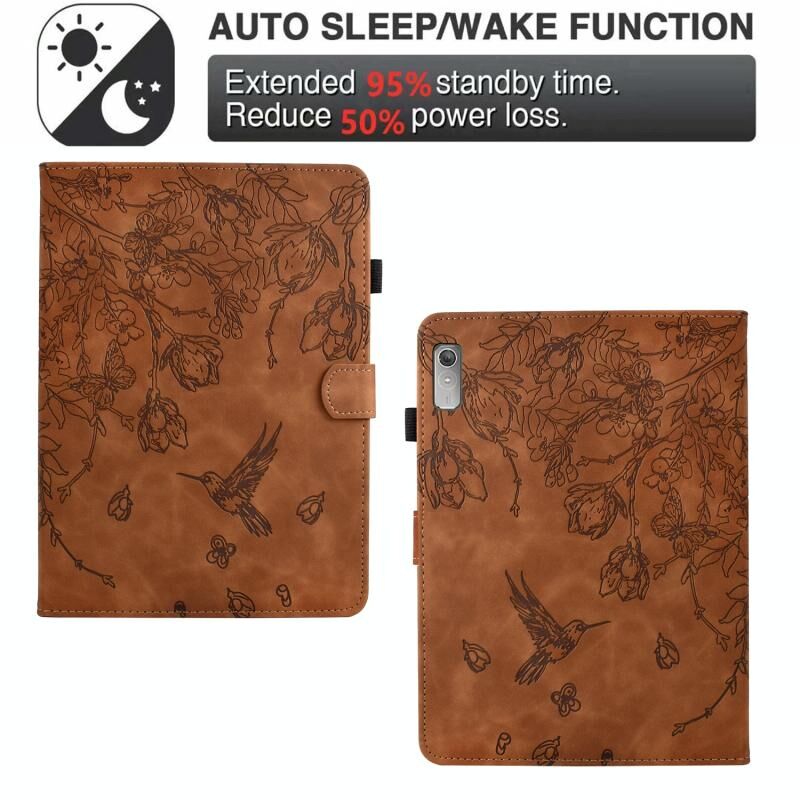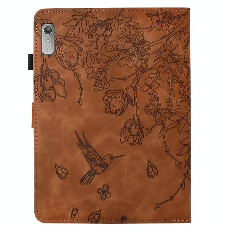 Θήκη για Lenovo Tab P11 2ης γενιάς με ανάγλυφα σχέδια λουλουδιών και πουλιών από έξυπνο δέρμα (Καφέ)